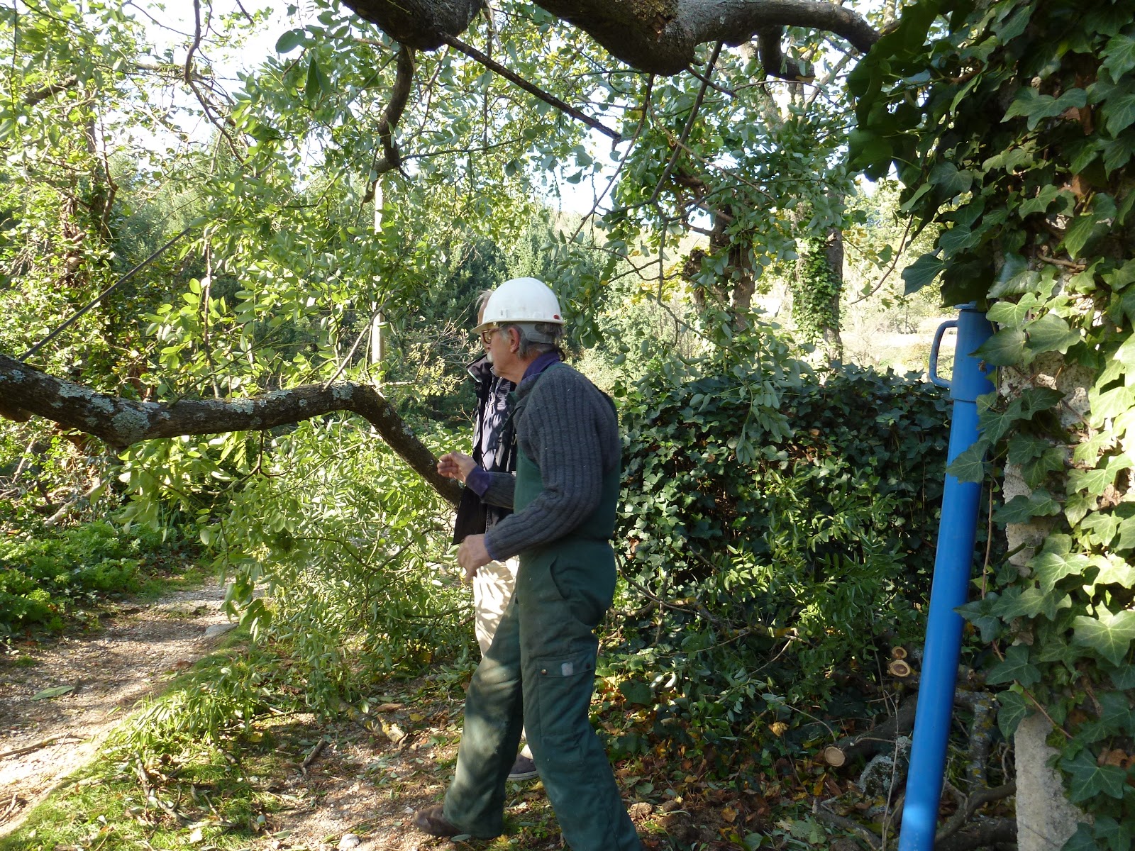 Met vereende krachten zoveel mogelijk weggezaagd en een stut onder de afgebroken boom geplaatst.
